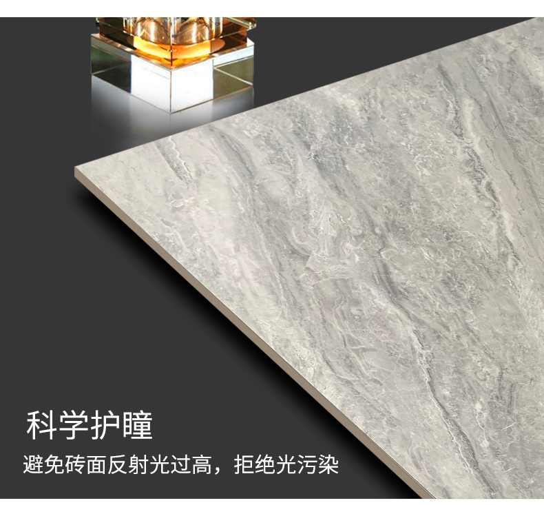 柔光瓷磚是磚面反射介于強光與弱光之間的一類瓷磚,其結合亮光類瓷磚的高調明艷裝飾和啞光類瓷磚的低調內斂搭配效果,通過動態柔光蠟拋技術,降低產品反光率,從而達到人體舒適的視覺感受以及無光污染的空間裝飾效果。優點:1.視覺舒適,無光污染 2.堅固耐磨,不易刮花.