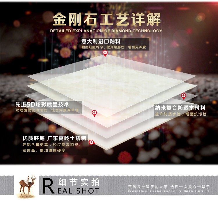 金曼古瓷磚廠家特價金剛石因高品質而得名,是一款極具天然石材效果和微晶石質感的仿石材瓷磚,它不但在價格、環保、耐用和清潔上極具優勢,在質感、規格、花色、重量等指標上,金剛石都遠遠勝于石材、拋光磚。相比其他種類的產品,它最大的特點可以用“高亮度、高耐磨、高平整、高逼真、高清晰、高環保”。