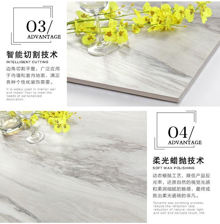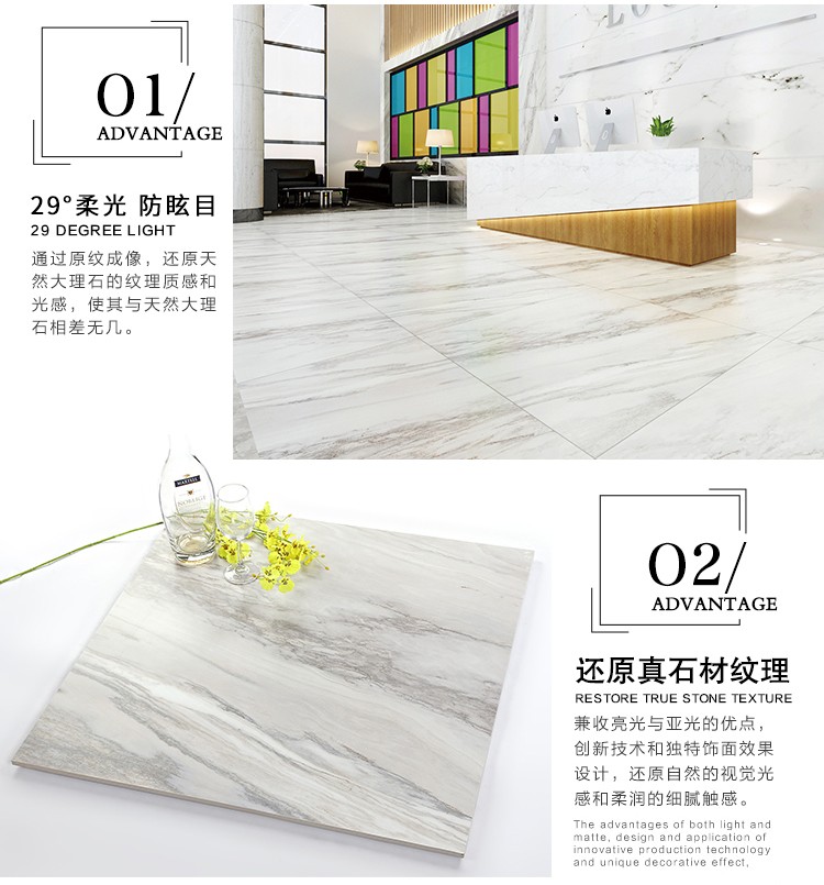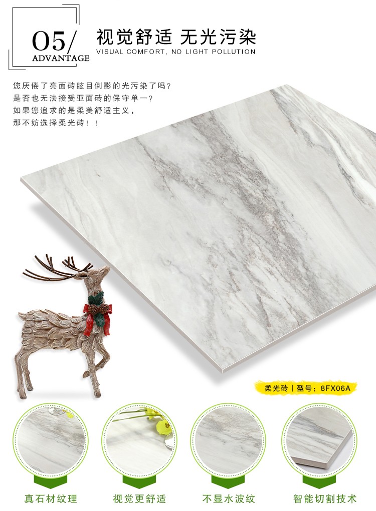 柔光瓷磚是磚面反射介于強(qiáng)光與弱光之間的一類瓷磚,其結(jié)合亮光類瓷磚的高調(diào)明艷裝飾和啞光類瓷磚的低調(diào)內(nèi)斂搭配效果,通過(guò)動(dòng)態(tài)柔光蠟拋技術(shù),降低產(chǎn)品反光率,從而達(dá)到人體舒適的視覺感受以及無(wú)光污染的空間裝飾效果。優(yōu)點(diǎn):1.視覺舒適,無(wú)光污染 2.堅(jiān)固耐磨,不易刮花.