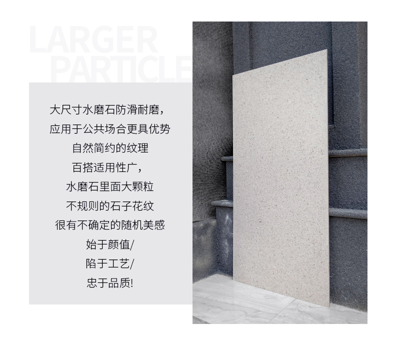 大尺寸水磨石防滑耐磨,應用于公共場合更具優(yōu)勢,自然簡約的紋理,百搭適用性廣,水磨石里面大顆粒,不規(guī)則的石子花紋,很有不確定的隨機美感。始于顏值/陷于工藝/忠于品質(zhì)!