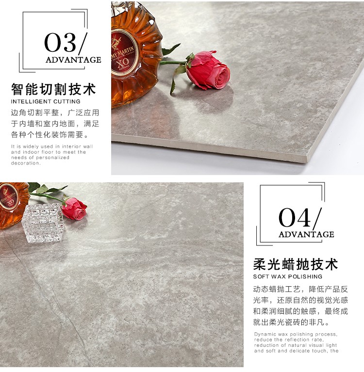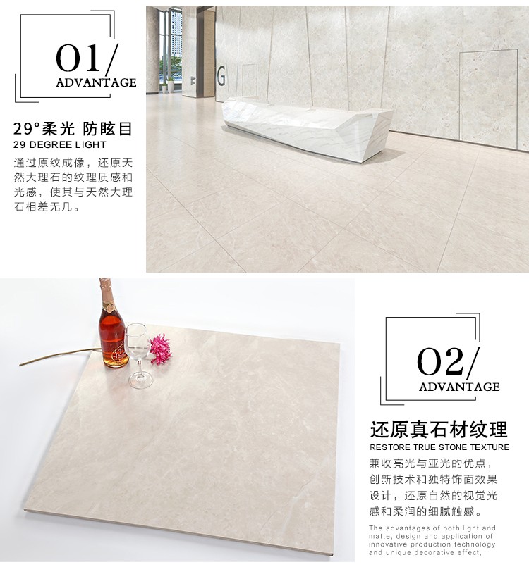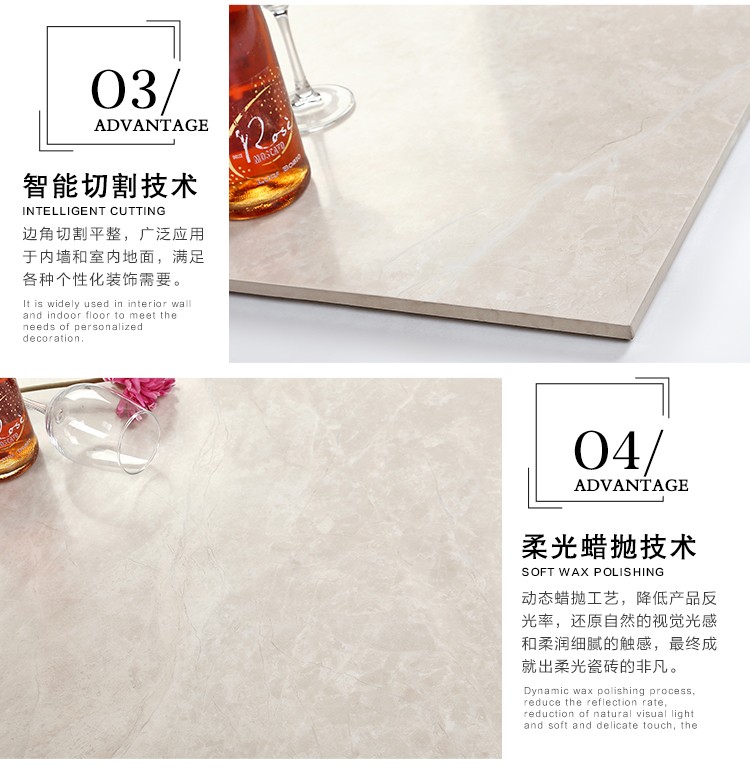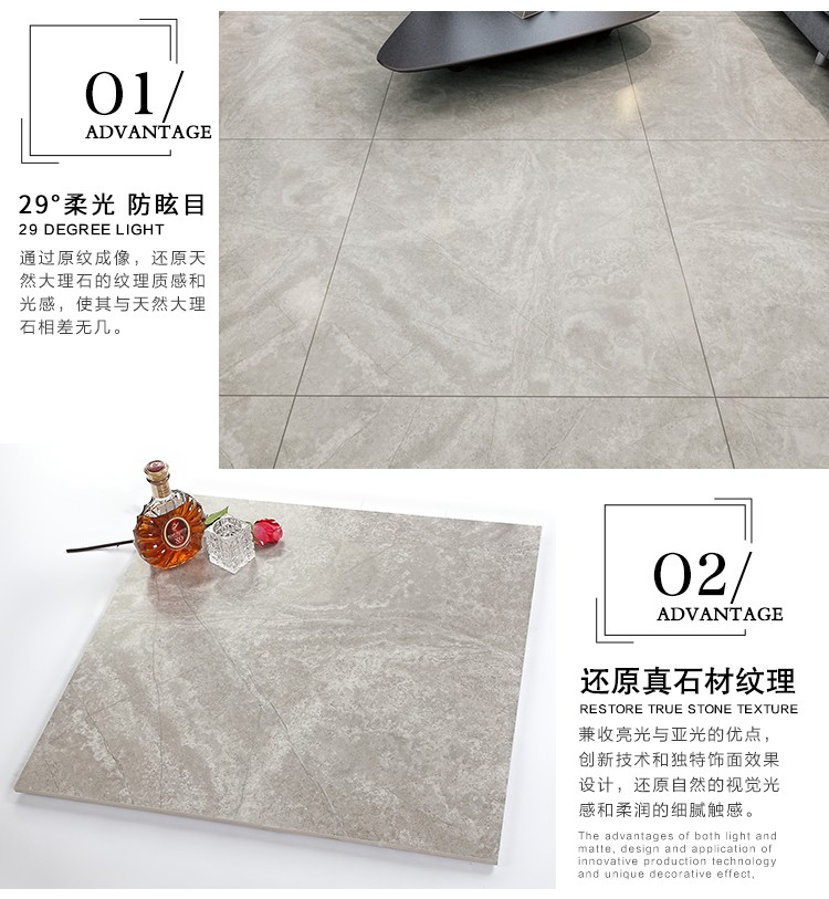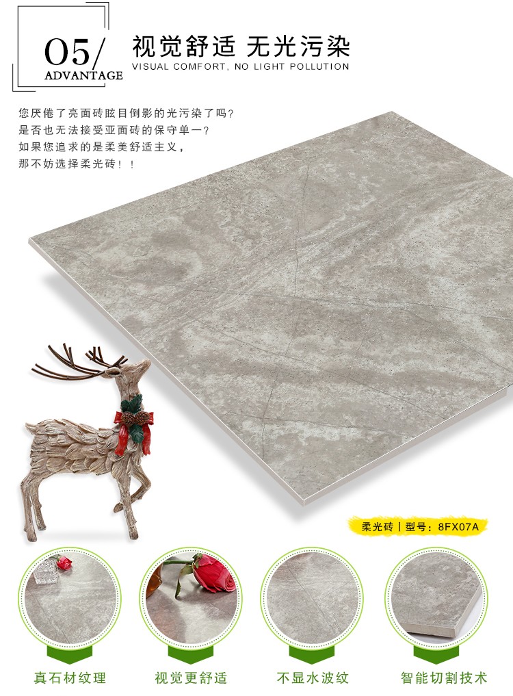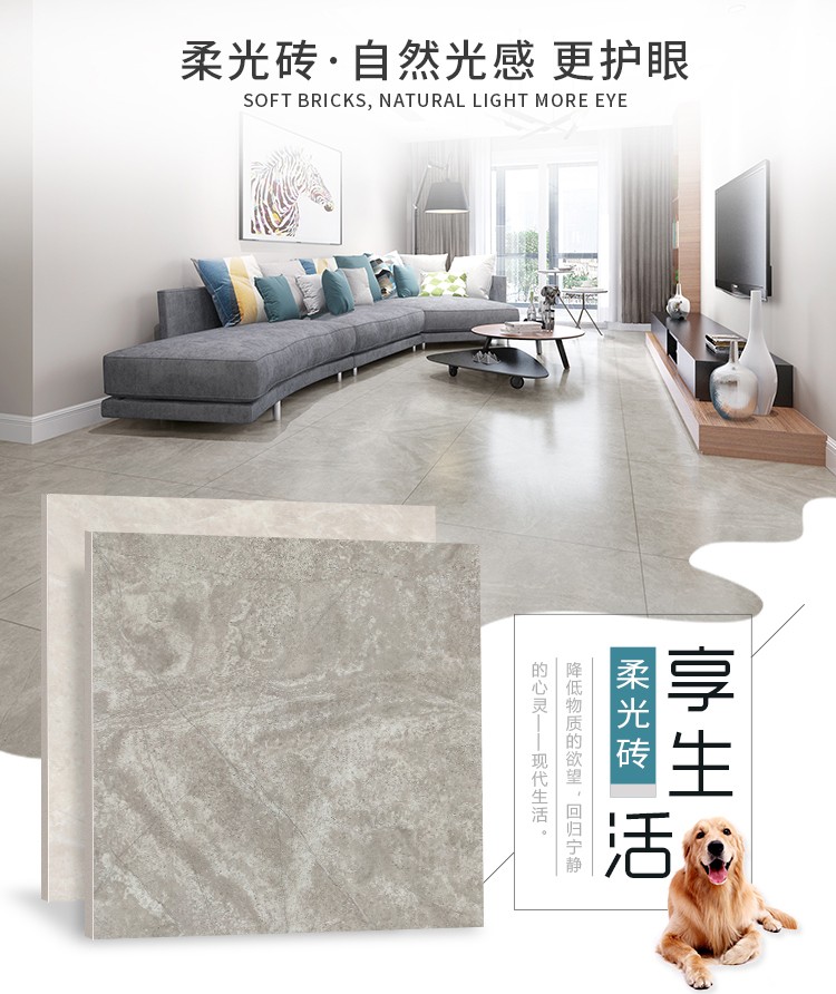 柔光瓷磚是磚面反射介于強光與弱光之間的一類瓷磚,其結合亮光類瓷磚的高調明艷裝飾和啞光類瓷磚的低調內斂搭配效果,通過動態柔光蠟拋技術,降低產品反光率,從而達到人體舒適的視覺感受以及無光污染的空間裝飾效果。優點:1.視覺舒適,無光污染 2.堅固耐磨,不易刮花.