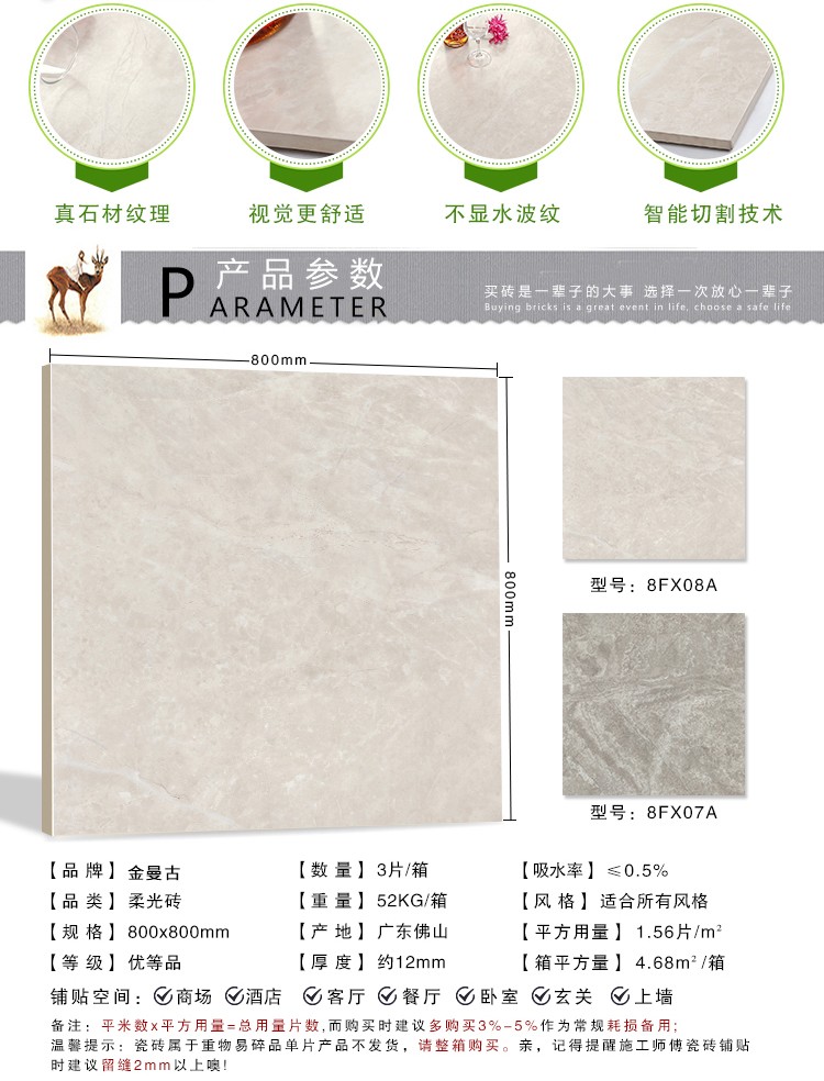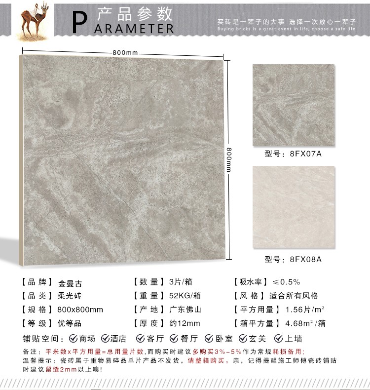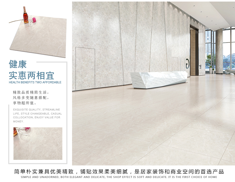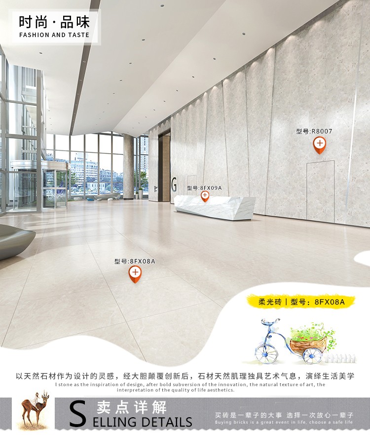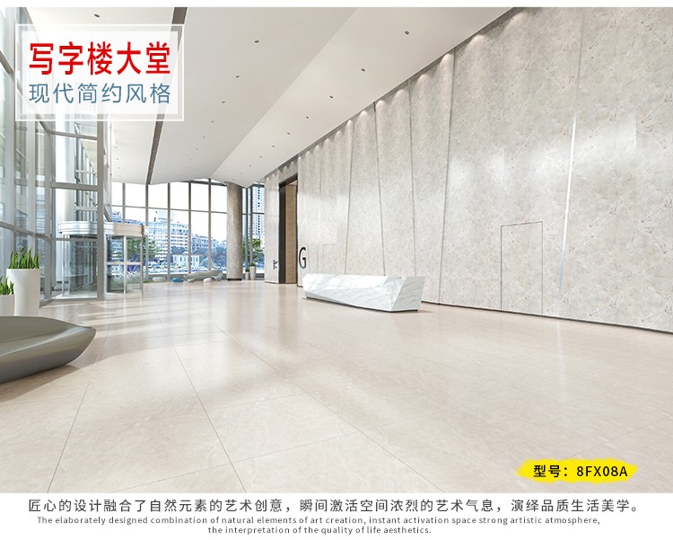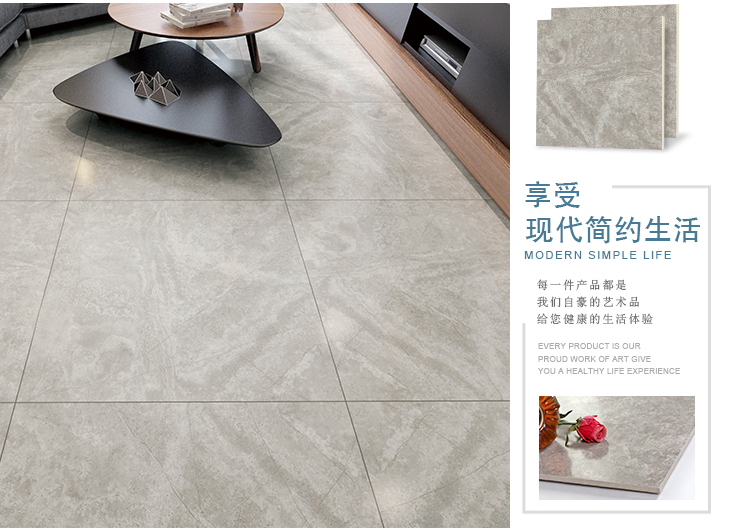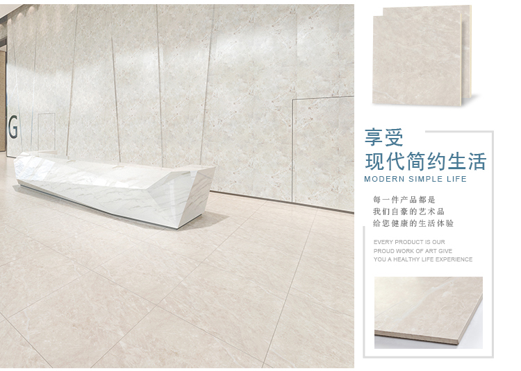 柔光瓷磚是磚面反射介于強光與弱光之間的一類瓷磚,其結合亮光類瓷磚的高調明艷裝飾和啞光類瓷磚的低調內斂搭配效果,通過動態柔光蠟拋技術,降低產品反光率,從而達到人體舒適的視覺感受以及無光污染的空間裝飾效果。優點:1.視覺舒適,無光污染 2.堅固耐磨,不易刮花.