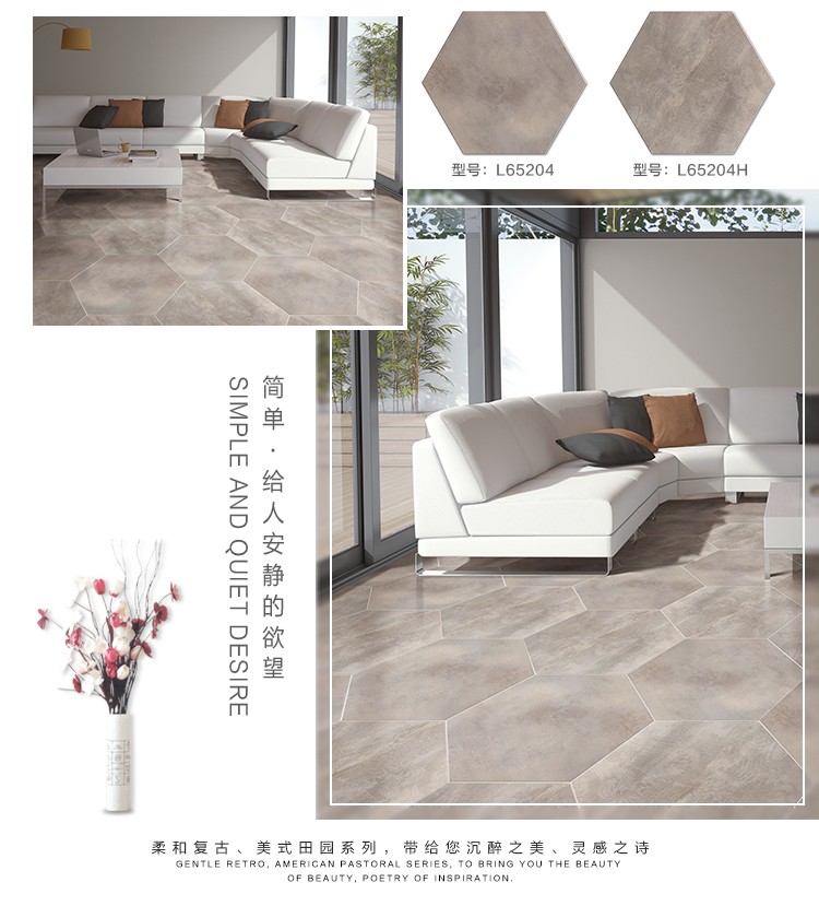 金曼古瓷磚廠家六角磚是一種表面呈現(xiàn)木紋裝飾圖案的環(huán)保建材.紋路逼真、自然樸實、沒有木地板褪色、不耐磨等缺點;曼古陶瓷木紋磚系列線條明快,圖案清晰為特色。本身具有阻燃,不腐蝕的特點,綠色、環(huán)保型建材;產(chǎn)品使用壽命長,耐磨,無需像木制產(chǎn)品那樣周期性地打蠟保養(yǎng)等。